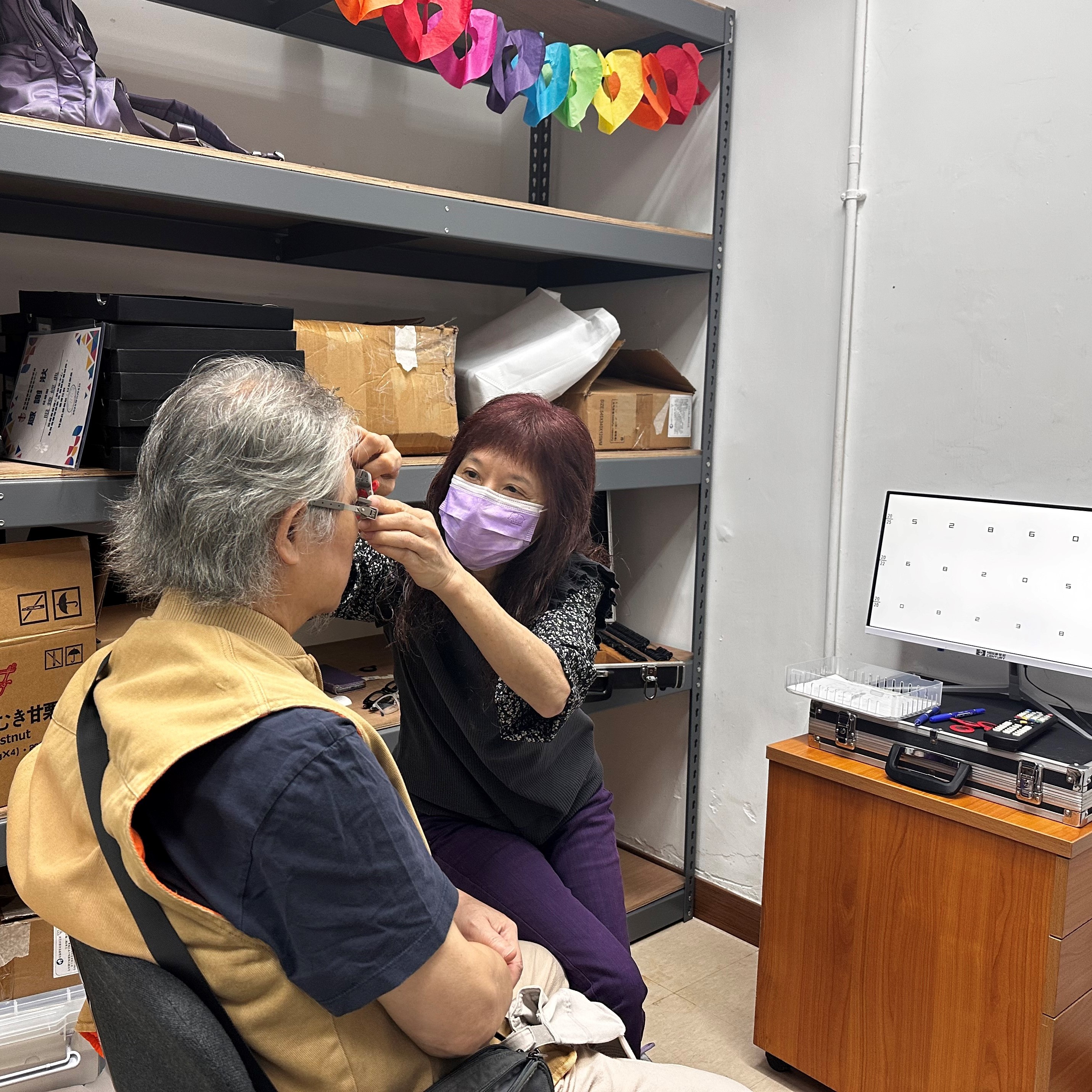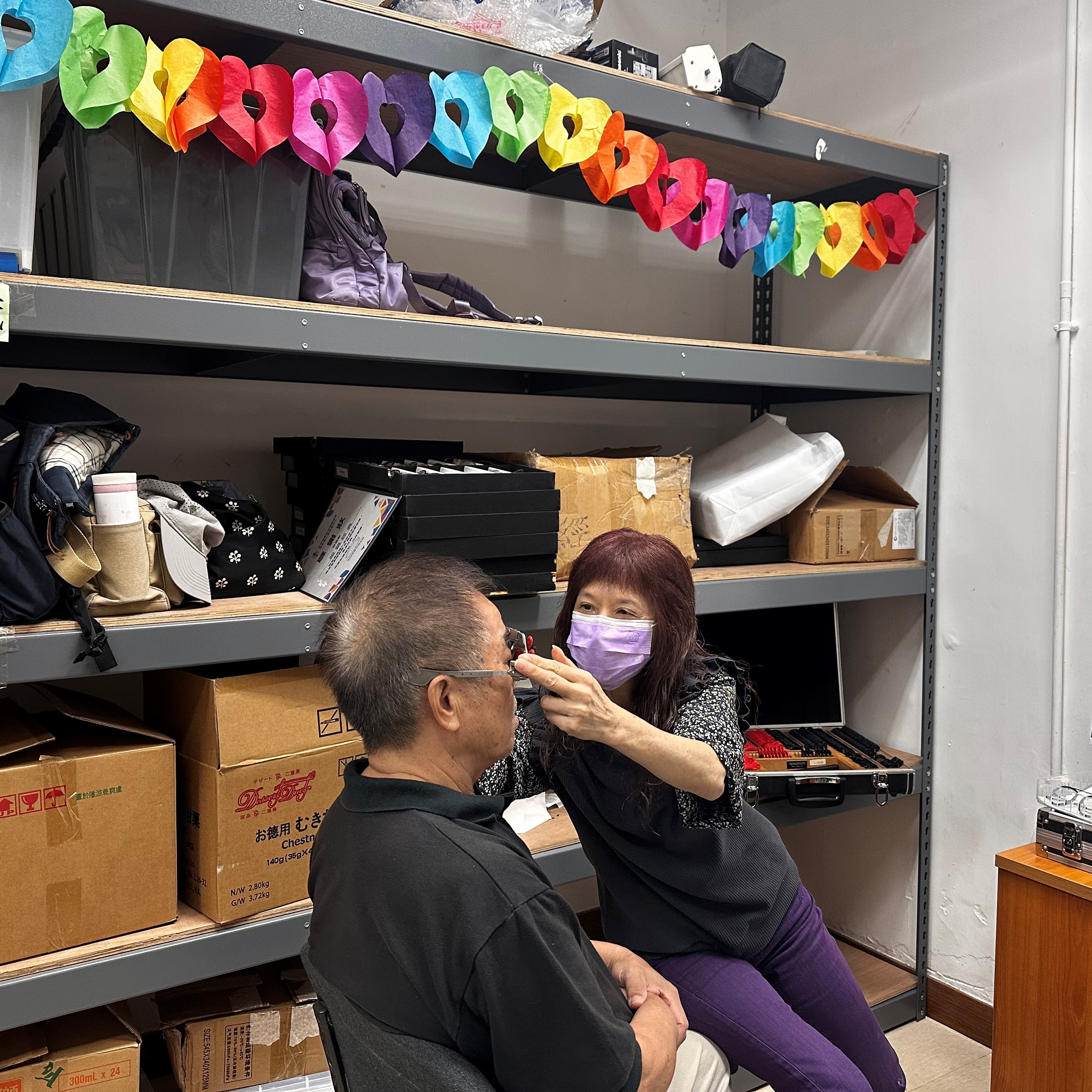 4. 調整和試戴:在活動中,為確保長者在配帶時更舒適, 眼鏡公司的專業人員並即時對鏡框進行調整,亦幫助長者進行試戴及進一步行必要的微調,以確保眼鏡的適配度。