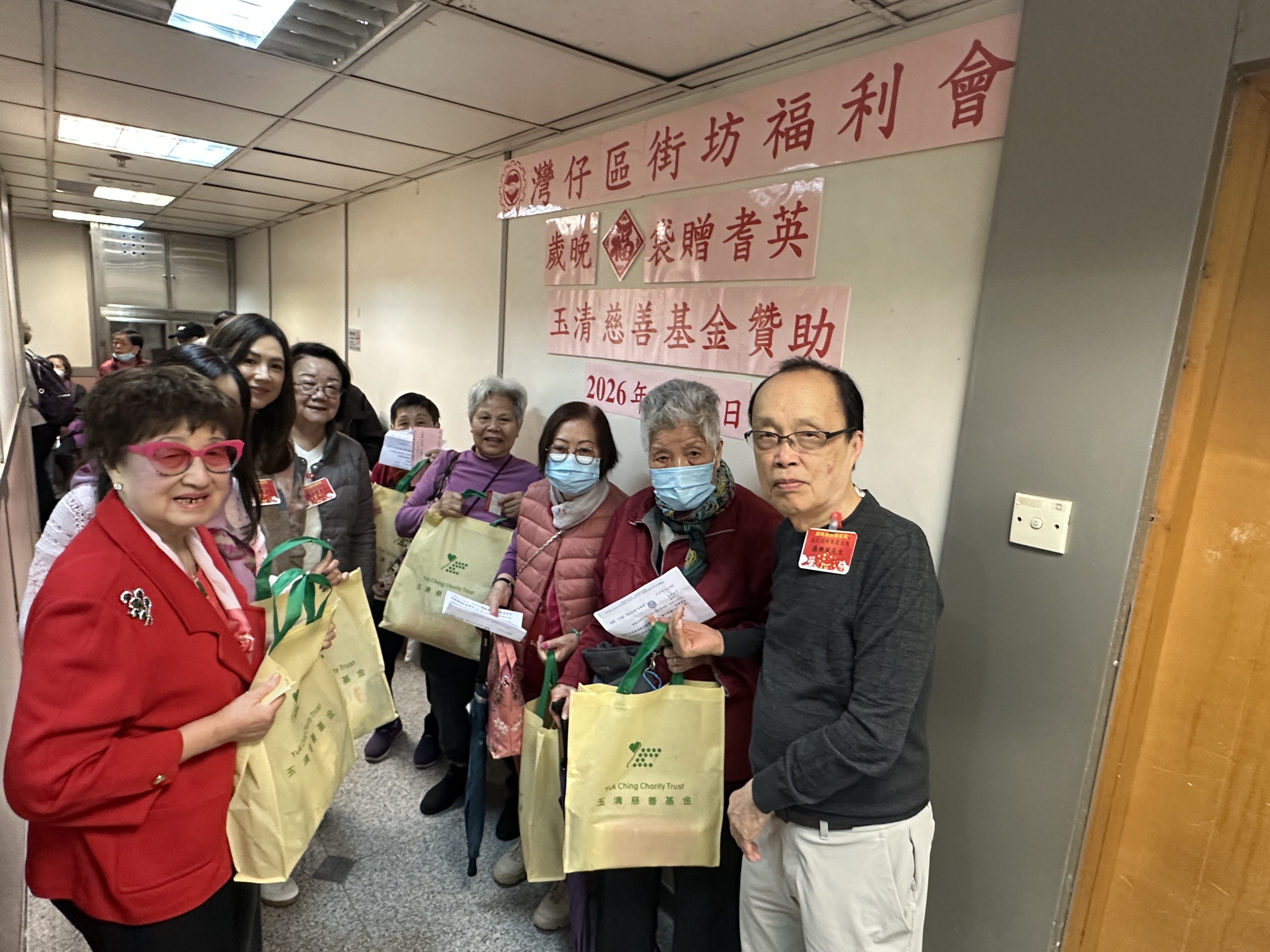 On 7 February 2026, as the Lunar New Year approached, the Yuk Ching Charity Trust once again offered generous support by donating 400 year-end gift packs, enabling the Wan Chai Kai-fong Welfare Association to deliver festive blessings to elderly residents in the district. The gift packs were well-stocked with rice, cooking oil, noodles, canned food, and a variety of daily necessities, with the aim of providing seniors with tangible care ahead of the New Year.